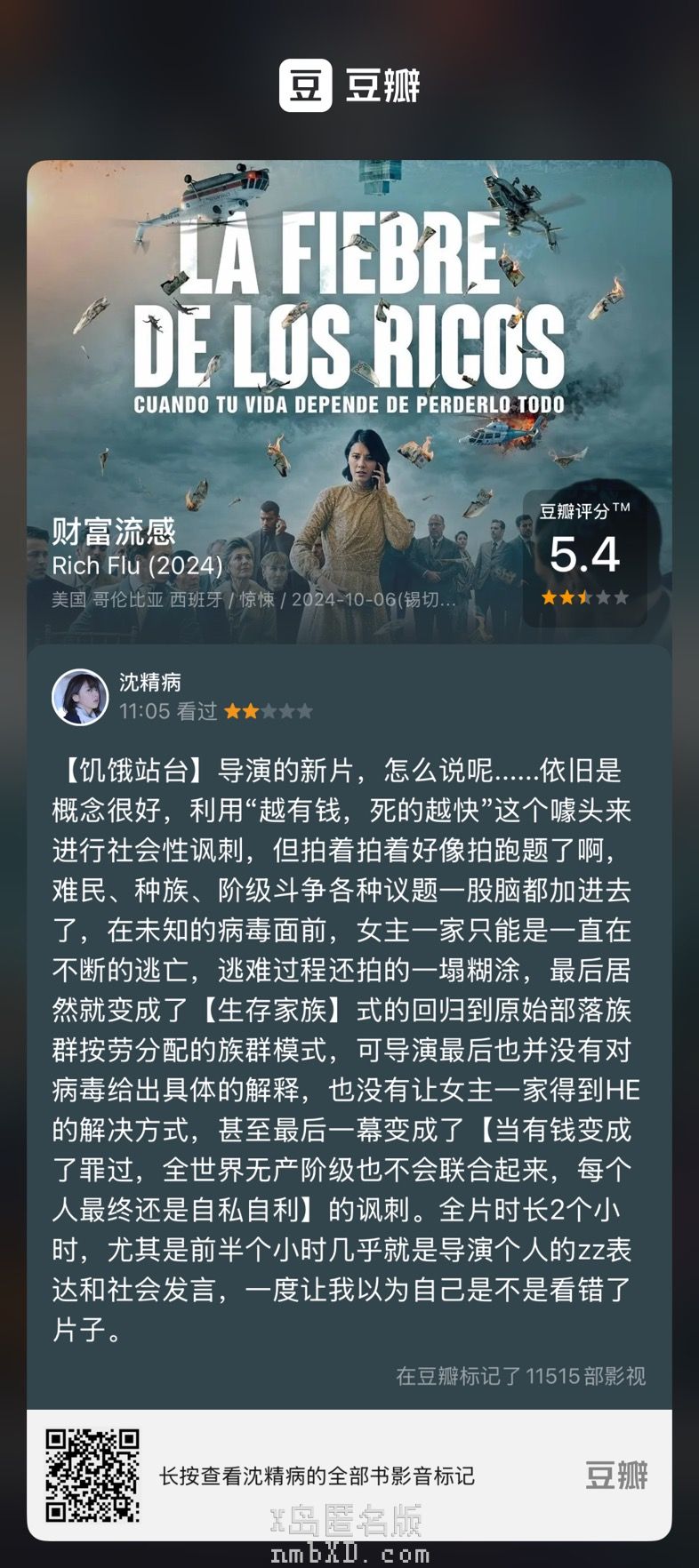 【饥饿站台】导演的新片,怎么说呢......依旧是概念很好,利用“越有钱,死的越快”这个噱头来进行社会性讽刺,但拍着拍着好像拍跑题了啊,难民、种族、阶级斗争各种议题一股脑都加进去了,在未知的病毒面前,女主一家只能是一直在不断的逃亡,逃难过程还拍的一塌糊涂,最后居然就变成了【生存家族】式的回归到原始部落族群按劳分配的族群模式,可导演最后也并没有对病毒给出具体的解释,也没有让女主一家得到HE的解决方式,甚至最后一幕变成了【当有钱变成了罪过,全世界无产阶级也不会联合起来,每个人最终还是自私自利】的讽刺。全片时长2个小时,尤其是前半个小时几乎就是导演个人的zz表达和社会发言,一度让我以为自己是不是看错了片子。