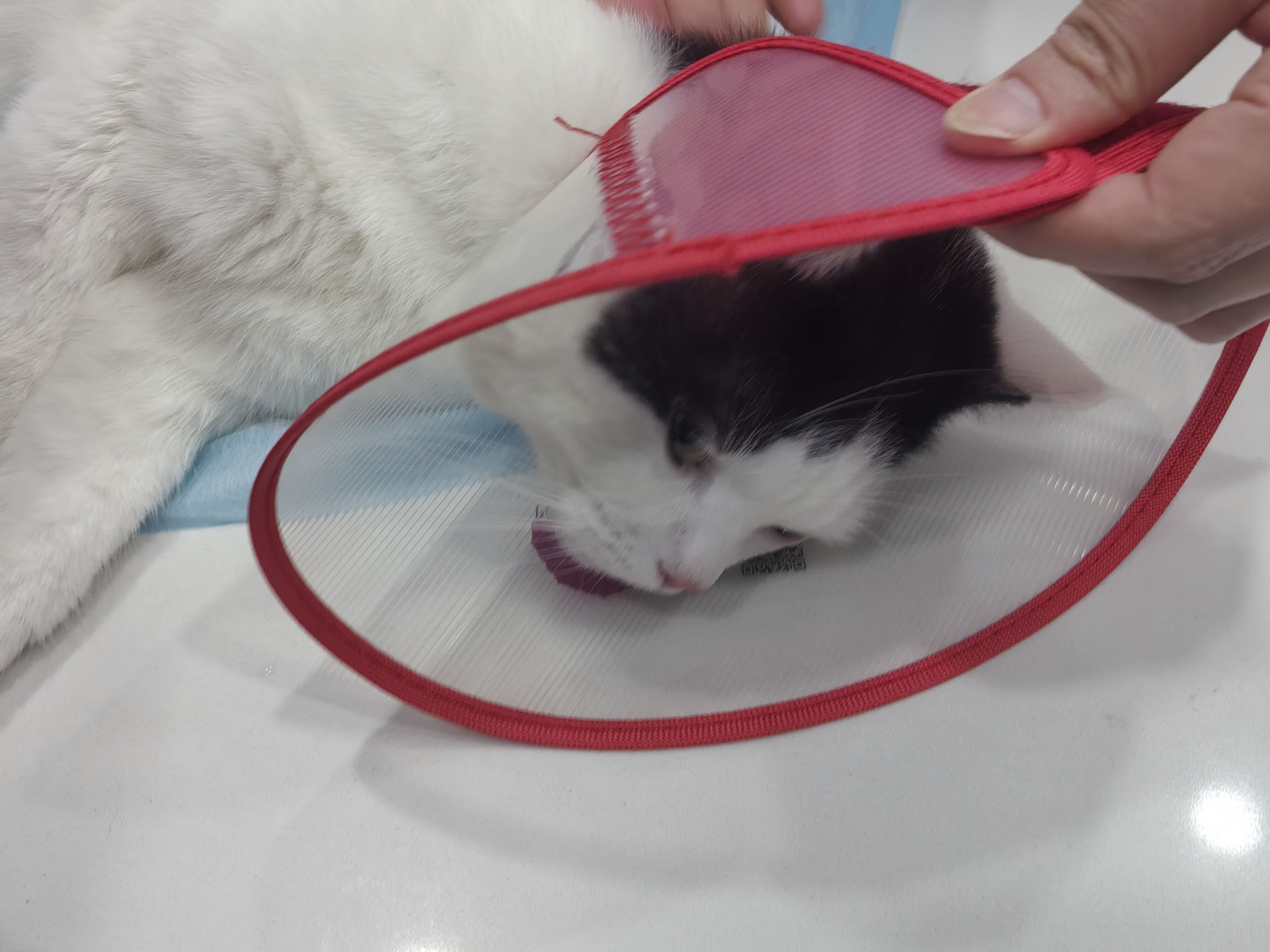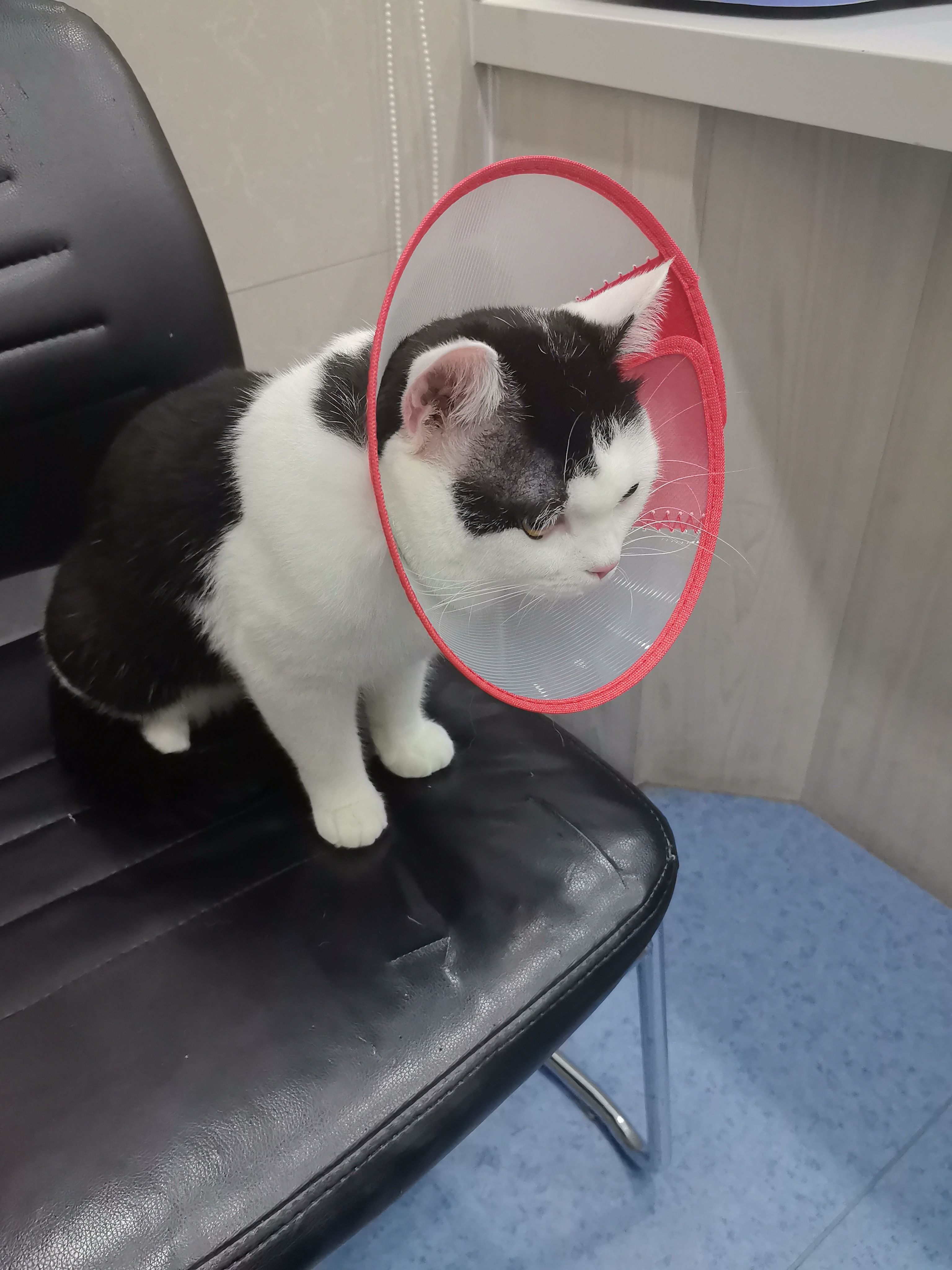 刚刚恢复意识以为有人要害他吓得飞起半人高,现在好多了戴个小圈,医生说他肾挺大的可能没啥毛病但检查结果几个指标一点点高,等有钱了带去看看