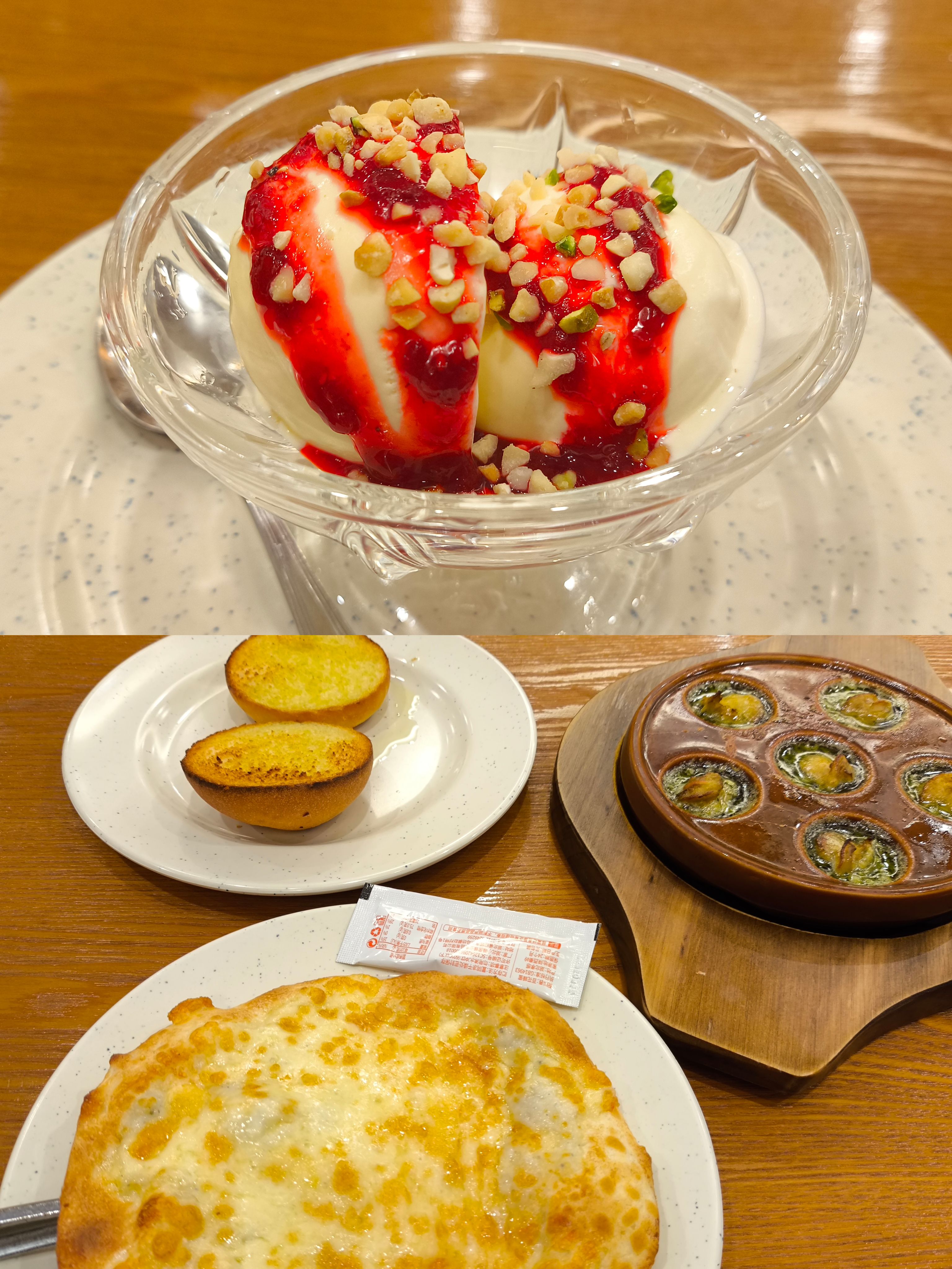 那个什么四款芝士披萨,长得像个荷包蛋,好咸……加点蜂蜜还能吃,但还是咸。冰淇淋也一般。蜗牛还行,不过面包也咸…