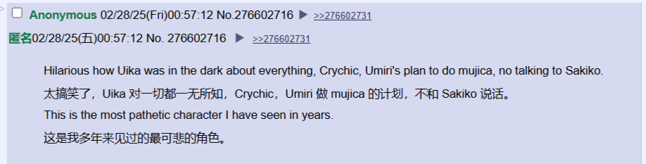 - 她这一集只找海铃是因为,海铃上一集群聊发了重组消息,但是群里没人回复(mortis是私聊回复的),在初华视角意味着「只有海铃想重组」,所以对她来说海铃是唯一希望了