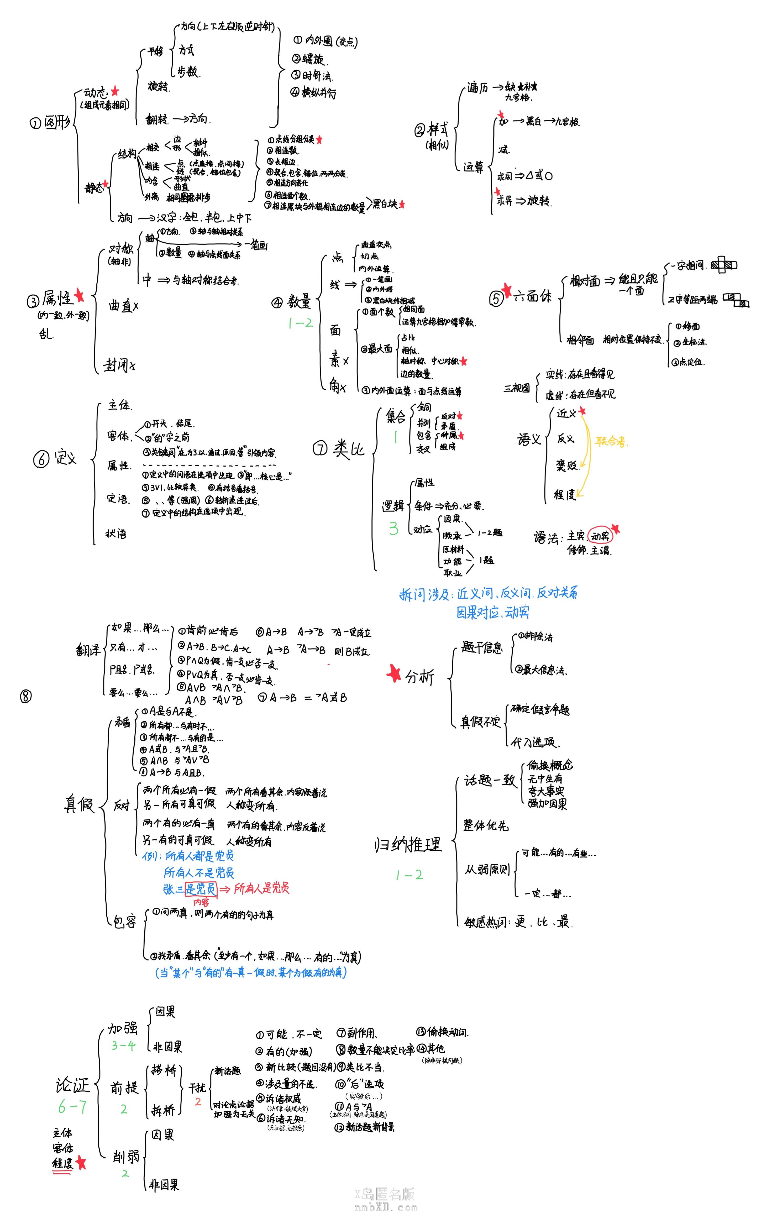 肥哥好,这是今年我们老师给我们过一遍时,我自己写的笔记,打X是她说大概率不会考的,打红星是重点,蓝色是备注,绿色的1-2是出题数目,有些看不太懂的地方不用在意,加油!(`・ω・)