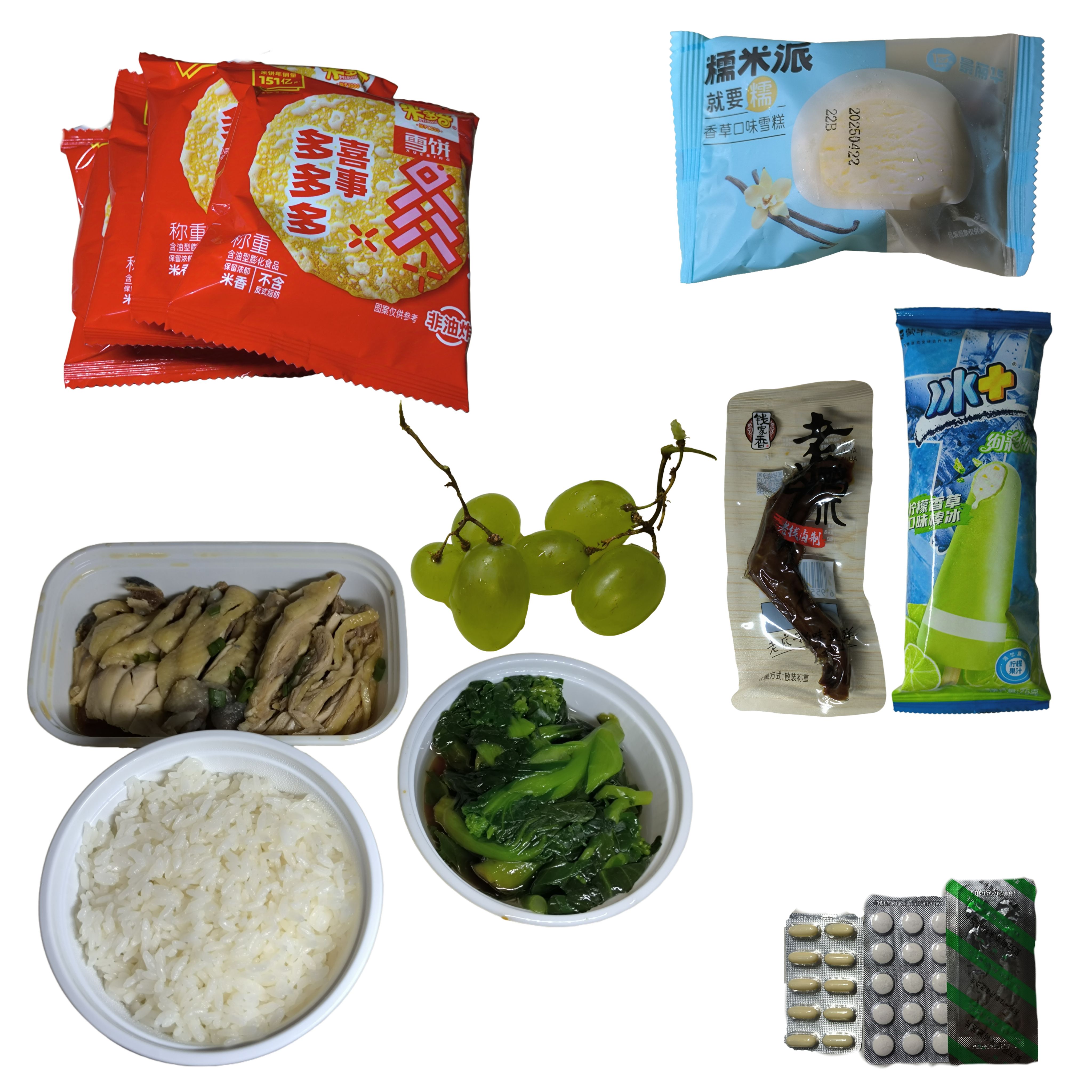 鸡小胸*2、去皮鸡腿、3个肉松小贝、鸡蛋、菠萝、半袋香芋片、蜜桃四季春、老酸奶、水、药