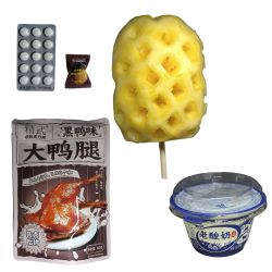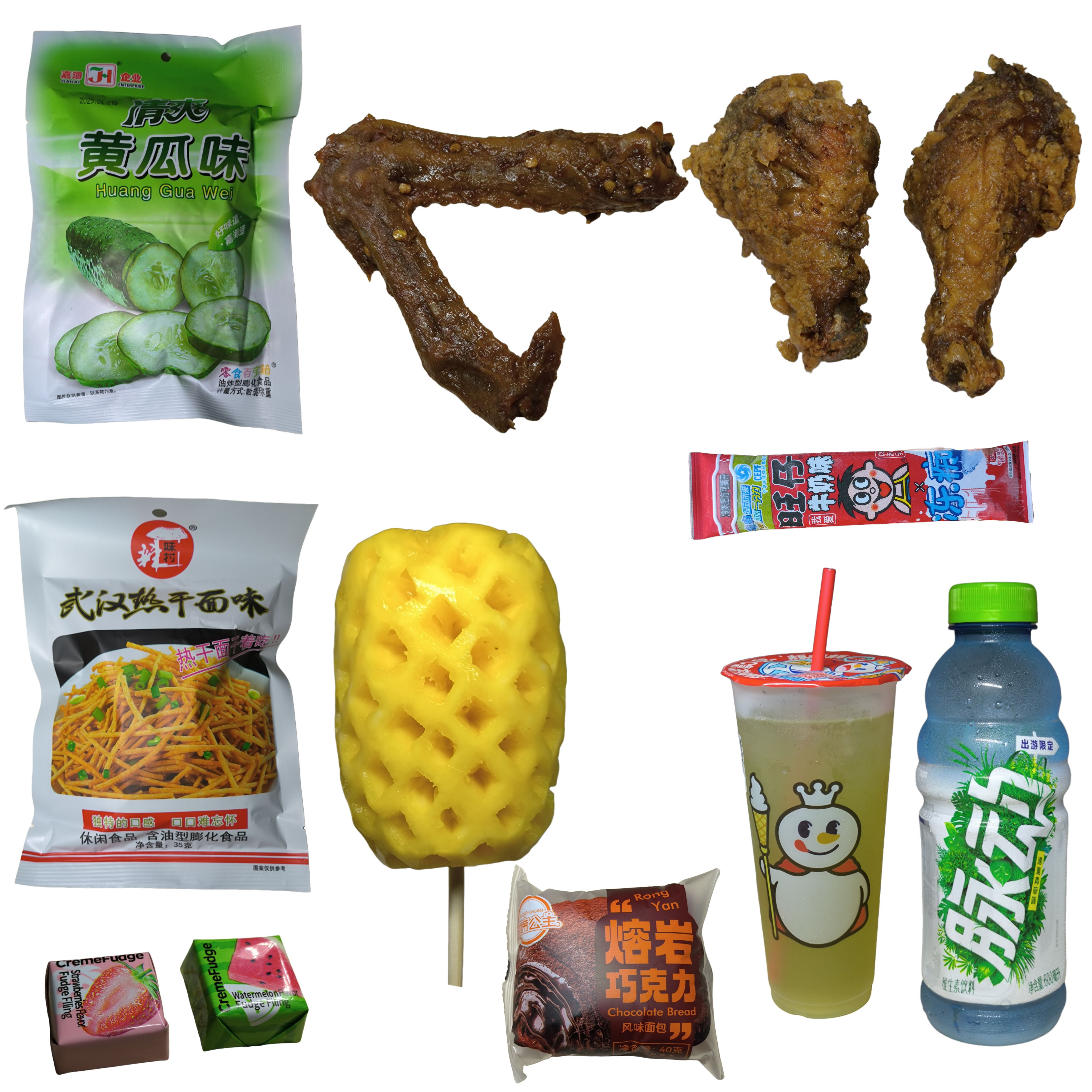 黄瓜薯片、热干面零食、巧克力、鸭翅、炸翅根、旺仔冻痴、菠萝、巧克力面包、青梅冰茶、脉动