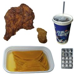 甜南瓜、炸鸡腿、炸鸡块、可乐、500ml水、药
