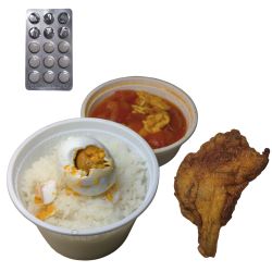 米饭、咸鸭蛋、炸鸡腿、西红柿炒蛋、500ml水、药