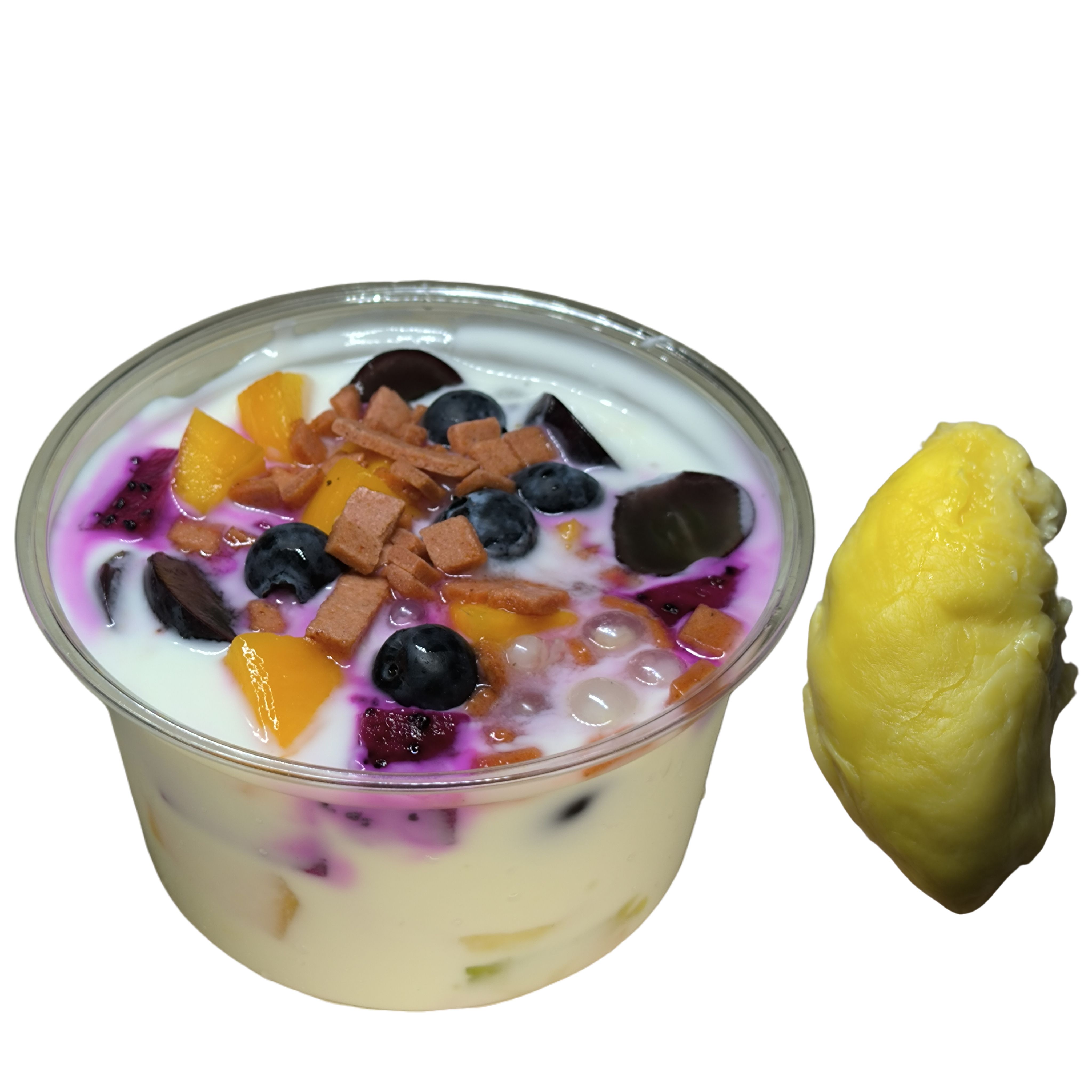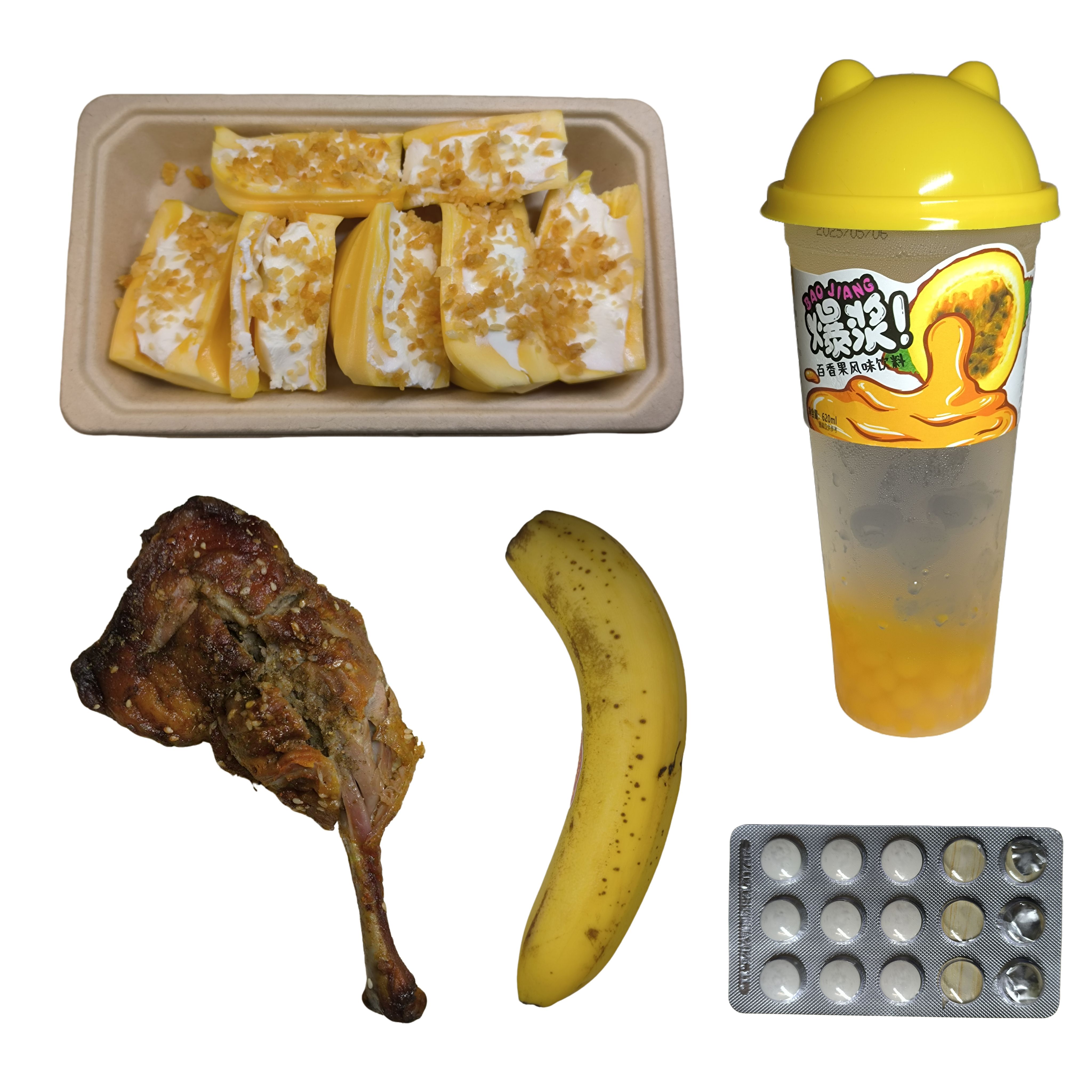 菠萝蜜夹酸奶椰酥、香蕉、烤鸭腿、爆爆珠饮料、菊花茶、药