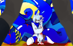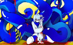 虽然一开始草图就有前面两条腿,但画的时候完全没有考虑这个,导致触手扭来扭去的细节完全被遮住了,位置非常巧妙,细节和前景只能二选一。