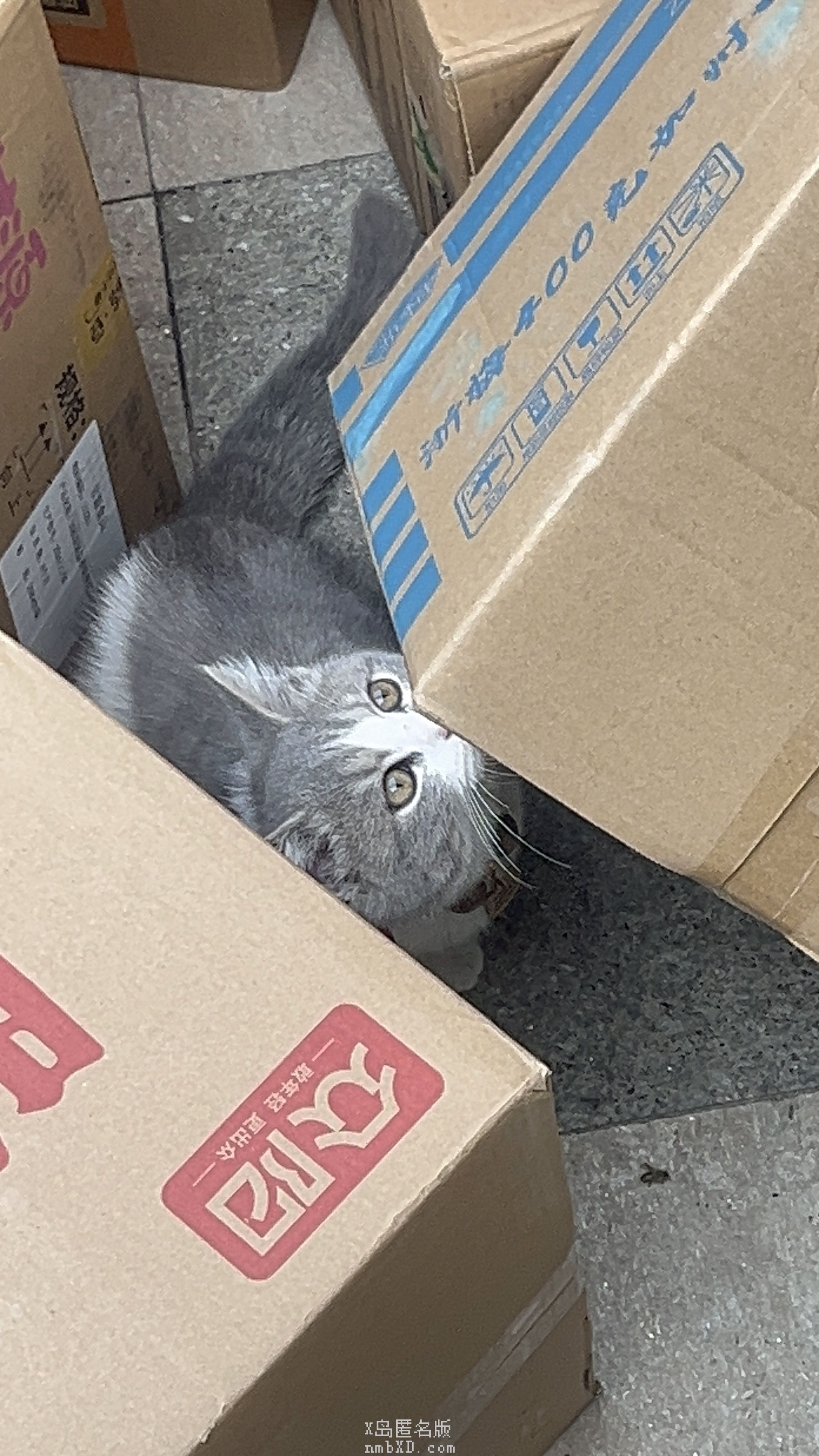 猫儿确实挺可爱的,像鱼一样在箱子堆里面游来游去