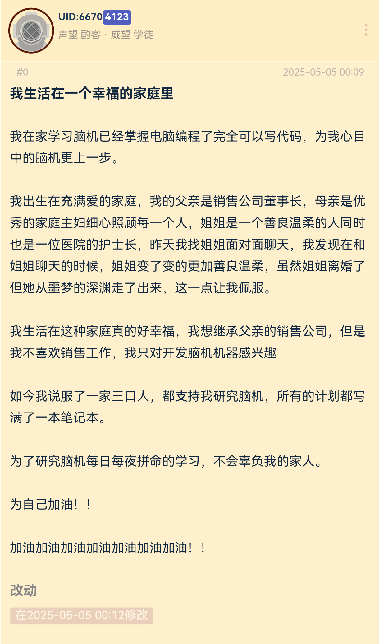 他爹情况应该是真的,能中专毕业一直家里蹲打游戏偶尔找关系混个工作,甚至容忍他搞脑机,家里条件应该不会差