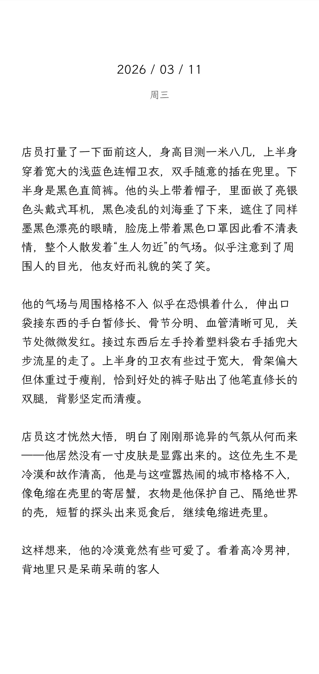 尝试改了一下。说实话,就这样,我都觉得甩的设定实在太多了,因为里面没有任何事件,纯粹的外貌描写。