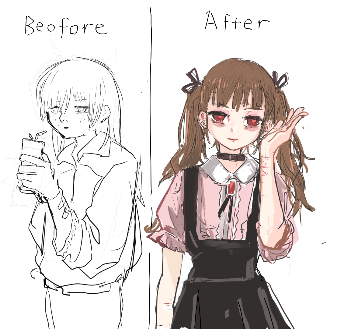我循声望去,只见一个身穿黑色裙装的双马尾女孩站在那里。白皙的脸上,眉毛紧蹙,深红色的瞳孔因不悦而微微放大,毫不掩饰地表达着对我拿走那罐粉色魔爪的敌意。