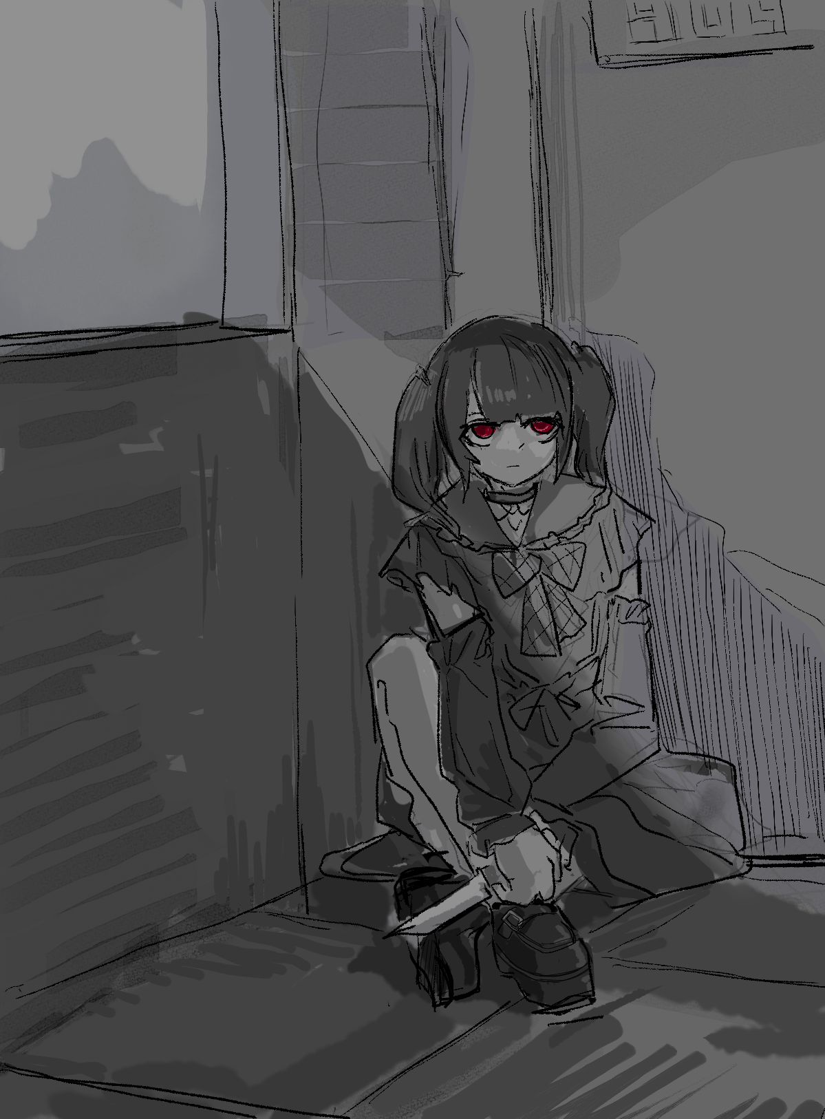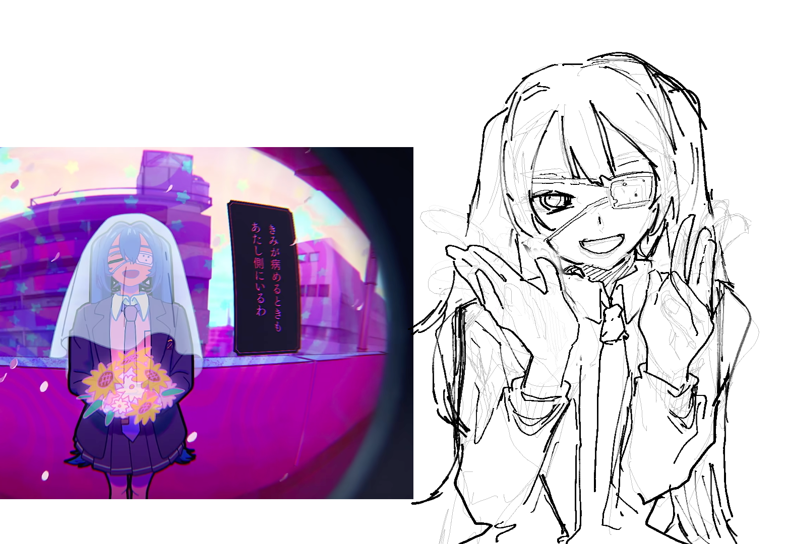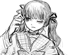 她身形娇小,穿着一身精致的黑色蕾丝裙装,梳着带挑染的黑色双马尾。刘海遮住了她的眼睛,让我看不清她的表情,但发丝间隐约露出的皮肤异常惨白,透着一种病态。她轮廓分明,宛如冷冽的骨瓷,在月光下泛着寒光。