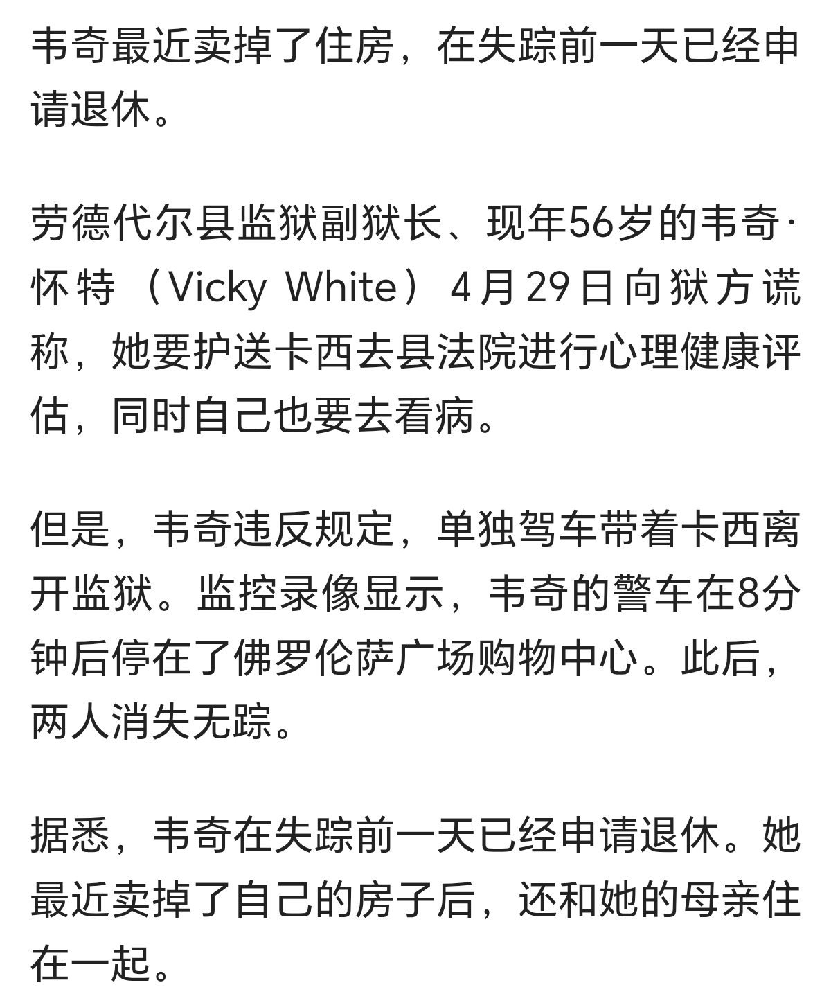昨天下午三点以后,狱警就没再看见凯西·怀特,但确实看见了他的名牌挂在那儿,所以也就没太在意,结果直到今天他也没回来”劳德代尔县警长办公室的警员回应道
