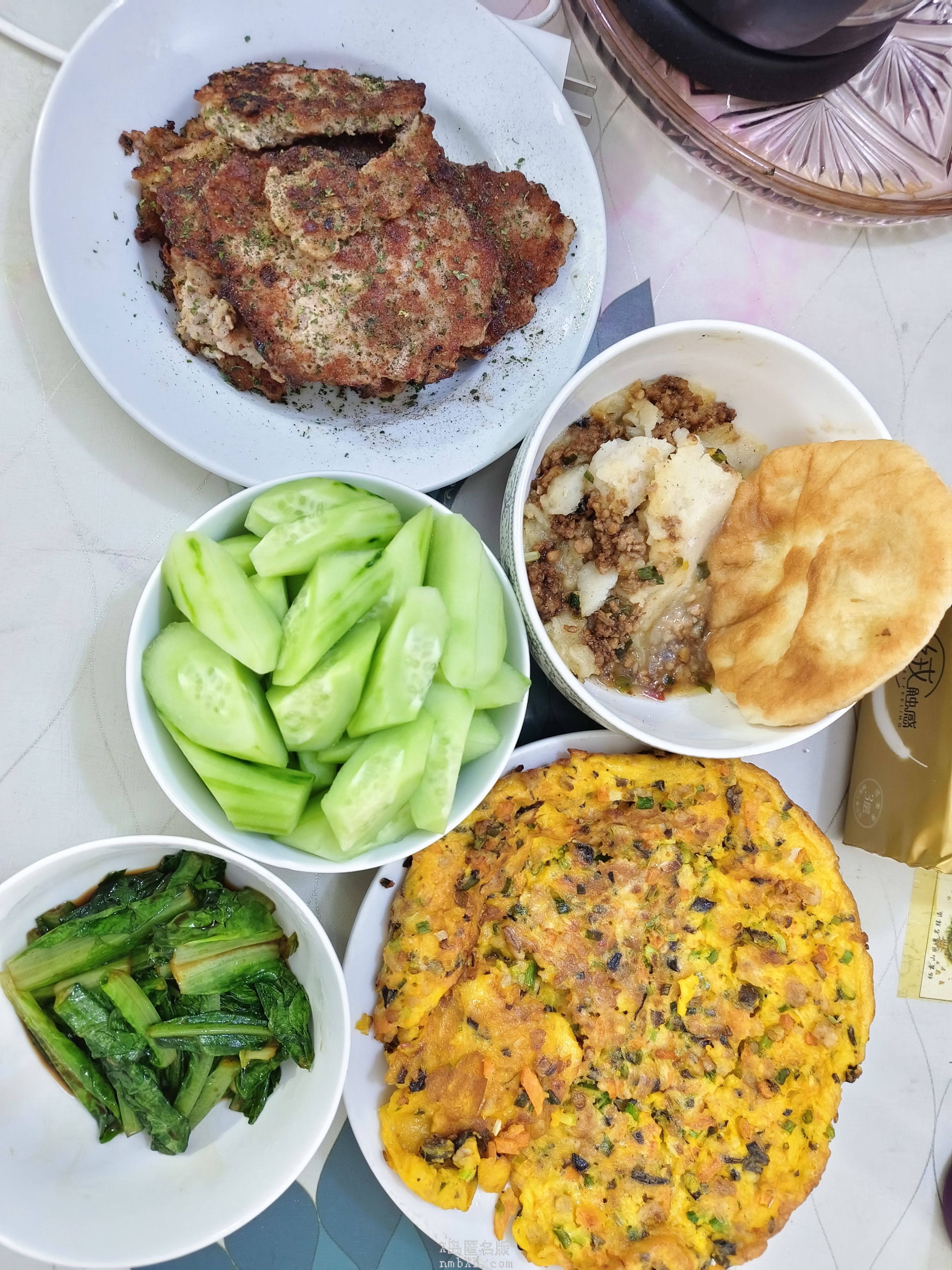 其实全是剩菜,汉堡肉是做肉沫炖蛋和土豆泥剩的,油麦菜是做素三鲜剩的,蛋饼里的配料也是( ゚∀。)