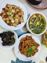 今天吃锅包肉,麻婆豆腐,炒木耳和菠菜汤(*゚∇゚)