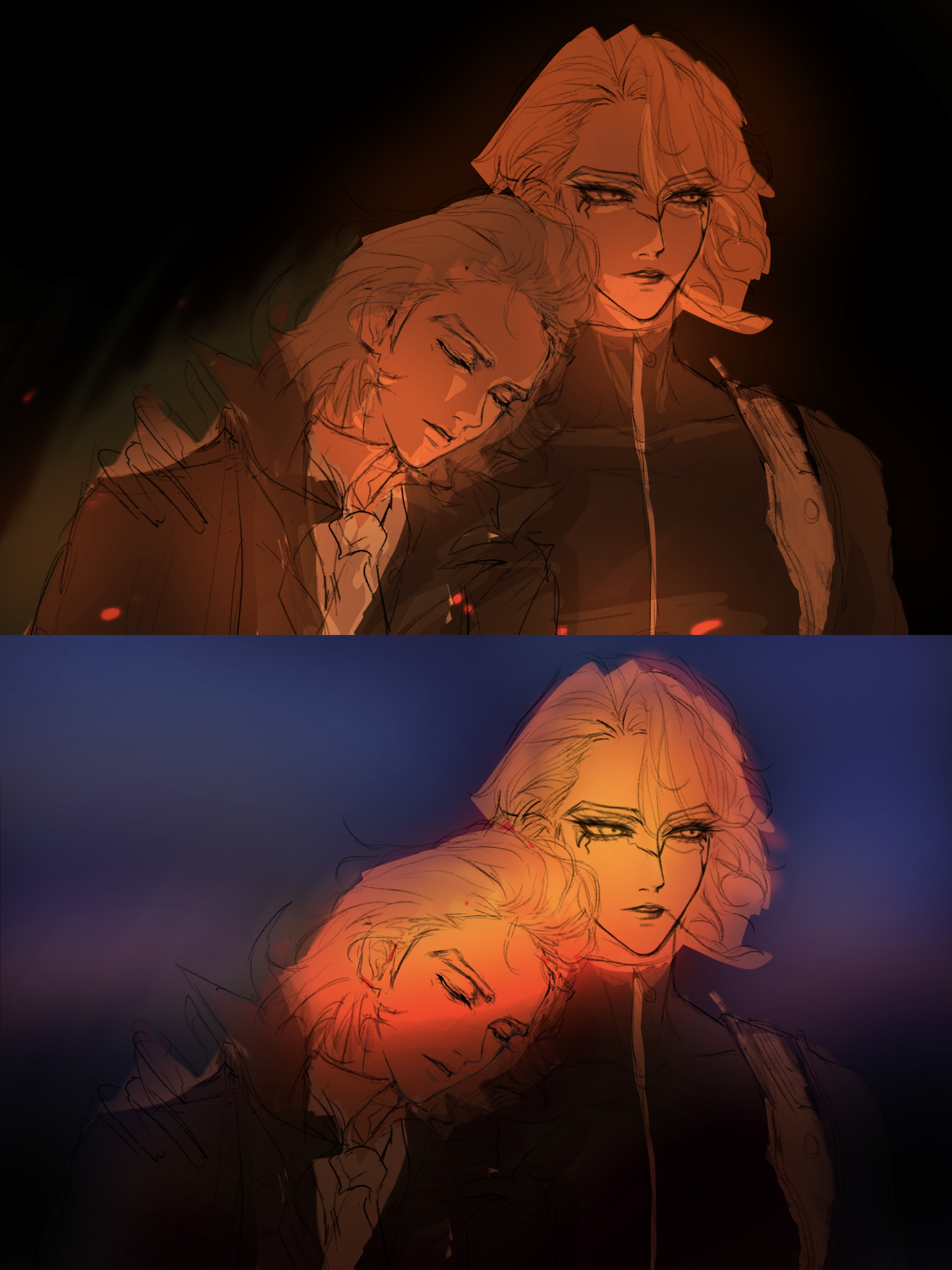 在纠结到底是画哪一种( `ー´)一开始灵感是篝火想画种依偎温暖感,刚刚突然觉得做成晨昏分割线构图很有故事感,而且想画成分不清到底是日出还是黄昏的感觉,但是整体感觉显得很“冷”。难以抉择