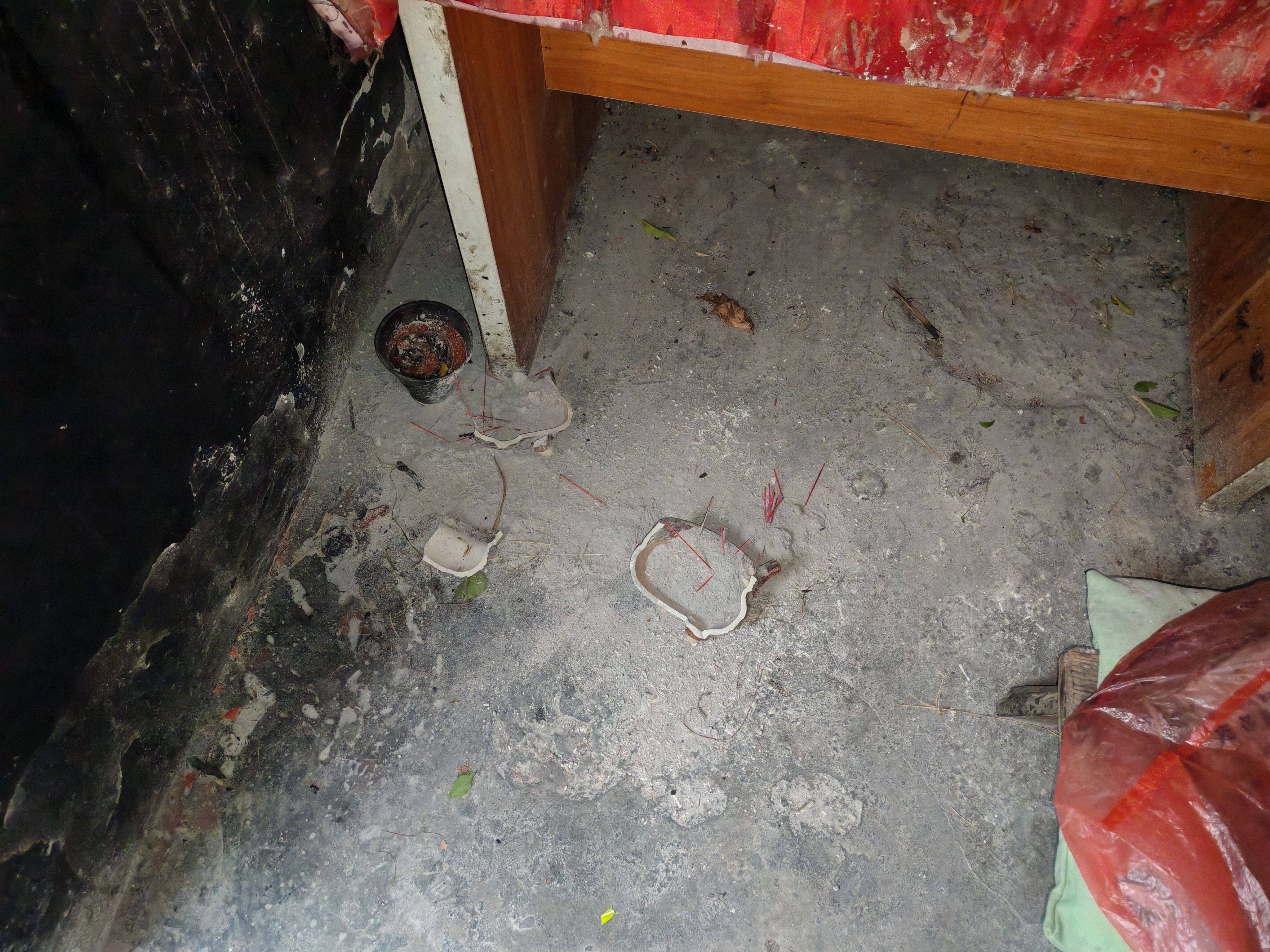 原来财神爷的香炉被小动物打碎了。