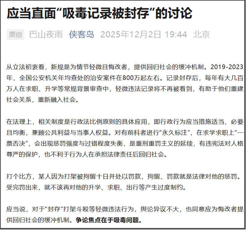 >>李春华:“这个实际上就是说作为行政违法来讲,因为我们知道行政违法不同于犯罪,在我们国家就是违法和犯罪的惩罚体系是二元惩罚体系,二元惩罚体系我认为它有一个比较大的好处是对违法行为人去犯罪标签化,就是行政惩罚对他惩罚了以后,他能够接受教训了以后不再实施新的违法行为,封存记录利于他以后融入社会,如果犯罪那你有了一个标签,融入社会可能会需要更多的努力,更多的成本。”