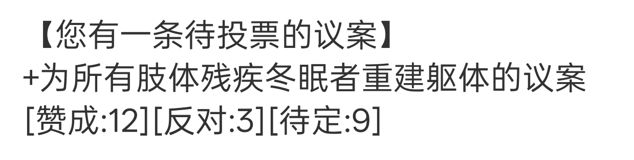 话说最开始关于肢体残缺修复的投票里,有9个待定,我们如果也是待定票的一员的话,是不是代表剩下8位待定也是和我们一样,是从冬眠中被唤醒的天命者。