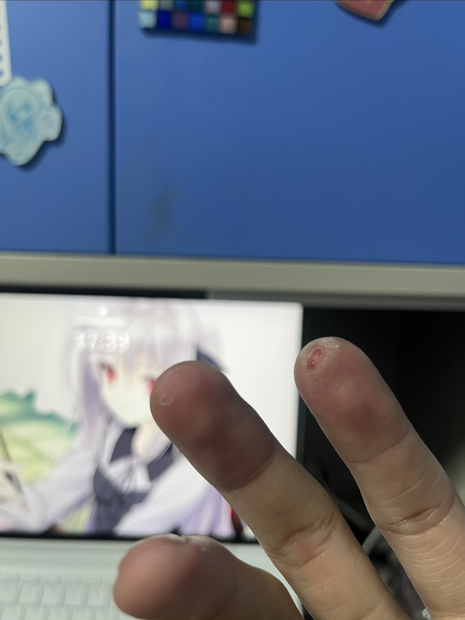 今天中指也成功起了水泡(被我剪了个口子放掉了组织液)希望早日练出茧来。现在疼是在长肌肉( `д´)