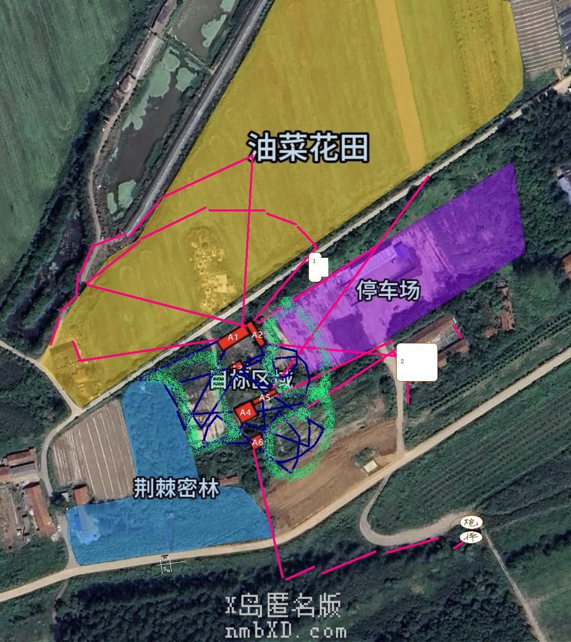 步兵沿停车场北侧公路路基,排水沟和绿化林隐蔽前行至图中框1处预备,随后先行乘车迂回的炮兵自南侧以烟雾封锁密林林线东南侧并持续压制A4,A5建筑内敌步兵,防止敌机动兵力支援